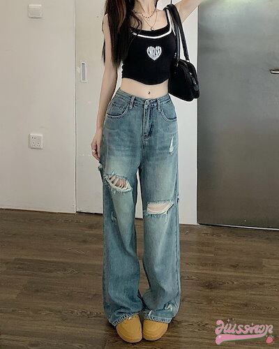2024春夏 パンツ デニム ジーンズ ワイド ストレート ハイウエスト 脚長効果 美脚効果 細見え 加工 カジュアル 韓国ファッション系 レディース お出かけ