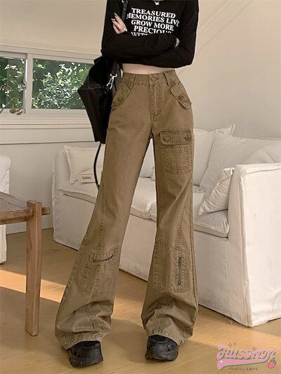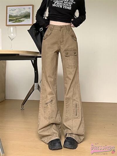 パンツ デニム ジーンズ ワイドレッグ ワイド ハイウエスト 脚長効果 美脚効果 細見え 春 茶色 ブラウン カジュアル 韓国ファッション レディース お出かけ