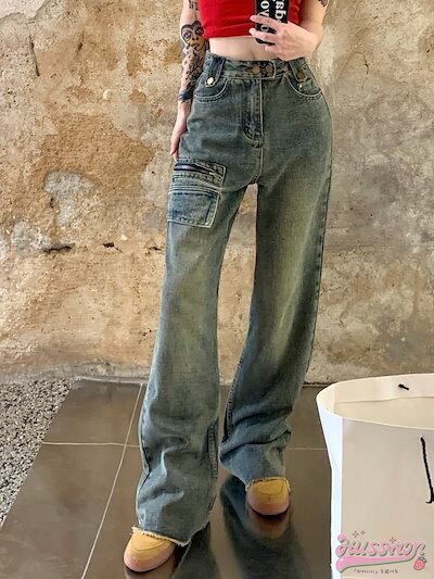 パンツ デニム ジーンズ ワイド ストレート ハイウエスト 脚長効果 美脚効果 細見え ウォッシュ加工 フリンジ 春 カジュアル 韓国ファッション レディース お出かけ