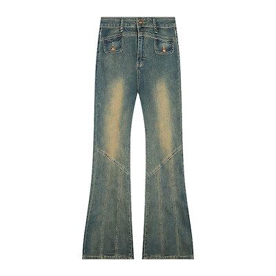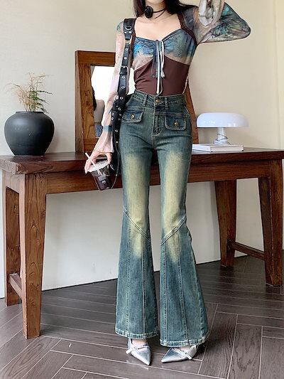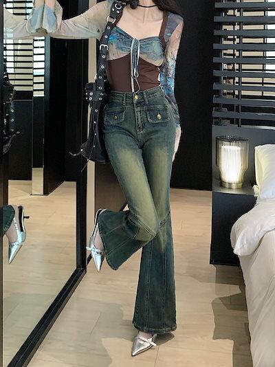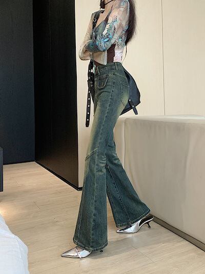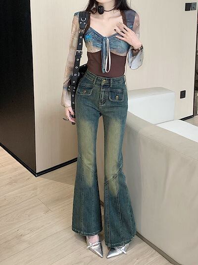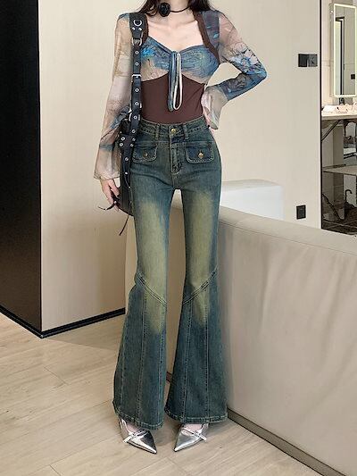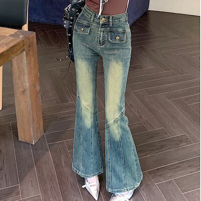 2024春夏 アメリカン パンツ デニム ブルー ジーンズ ロング丈 スキニー レッグ加工 ハイウエスト 脚長効果 美脚効果 細見え 秋 カジュアル 韓国ファッション お出かけ