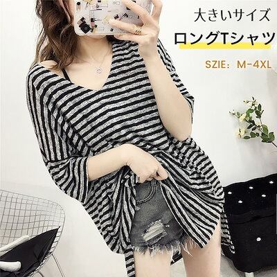 Tシャツカットソー 大きいサイズ tシャツ 半袖 レディース 夏 韓国ファッション ゆったり Vネック 着痩せ 半袖トップス 体型カバー ストライプTシャツ 怠惰な風 ロングTシャツ ?薄 冷感 部屋