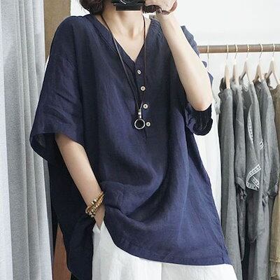 大きいサイズ ゆったり 夏服 Tシャツ カジュアル 麻ブラウス 薄手 怠惰な風 百掛け Tシャツ 半袖 トップス Vネック着痩せ カジュアル 体型カバーTシャツカットソー 無地