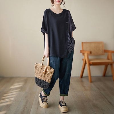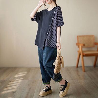 夏新作 大きいサイズ 夏服 ゆったり tシャツ 半袖 レディース 怠惰な風 薄手 カジュアル綿麻Tシャツカットソーおしゃれ 百掛け 半袖 トップス 色切り替え ブラウス