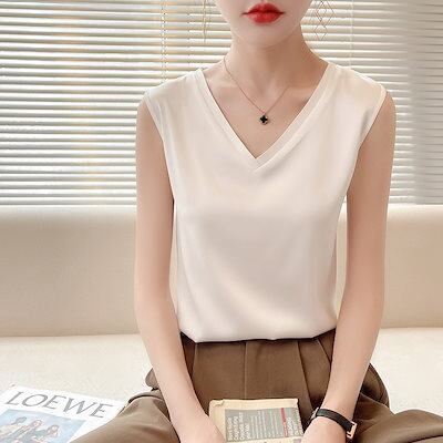 【上品】夏 ノースリーブキャミソール サテンシンプル高級感 トップス アイスシルク 百掛け インナー着痩せ Vネック 韓国ファッション シャツ レディース シフォンブラウスおしゃれヨガウェア