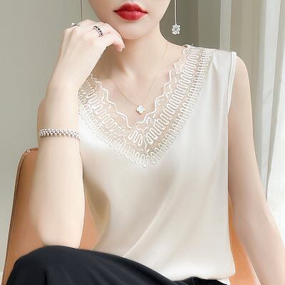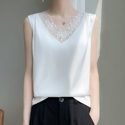 【上品】夏 ノースリーブサテン ブラウス 高級感 垂れ感 シャツ レディースアイスシルクキャミソール 韓国ファッション トップス 百掛け インナー シフォンブラウス