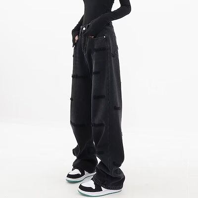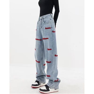 スラックスパンツ大きいサイズ刺繍ワイドパンツ復古モッピングパンツ 着痩せジーンズ
