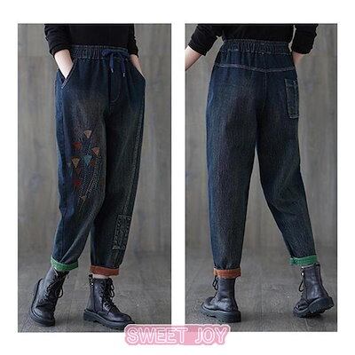 新入庫 サルエルパンツ デニム 刺繍 裏起毛 テーパードパンツ ボトムス ズボン レディース カジュアル ポケット付き ゆったり ウエストゴム 無地