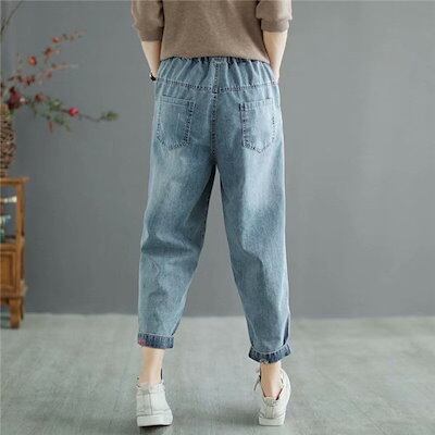 サルエルパンツ デニムパンツ 刺繍 花柄 レディース Gパン ゆったり カジュアル ガウチョ 30代 ウエストゴム ワイド おしゃれ 体型カバー