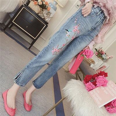 デニムパンツ レディース スキニー 刺繍 花柄 スリット ボトムス ジーンズ ストレッチ 伸びる 細身 アンクル丈 美脚 カジュアル スリム 薄手