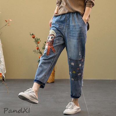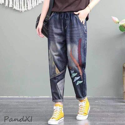 デニムパンツ レディース ワイドパンツ 森ガール風 ウエストゴム 刺繍花柄 カジュアル ストレッチ 大きいサイズ ゆったり 民族風 旅行 大人