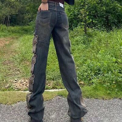 女性用ファッションジーンズレトロスタイルハイウエスト刺繍穴ゆったりとした床丈の蝶中空ワイドレッグパンツ