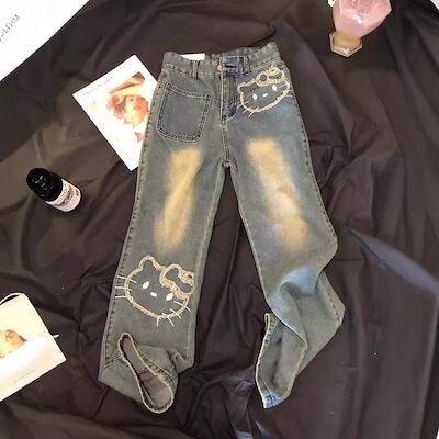 レトロなブルー刺繍ハローキティktストレートジーンズ女性春夏韓国レトロゆるい高腰ワイドパンツ