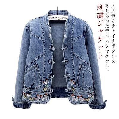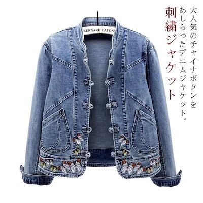 デニムジャケットエスニック刺繍春作レディースアウターチャイナボタン長袖Gジャン立ち襟30ブルゾン刺繍ジャケット春秋デニムジャケットジャケット