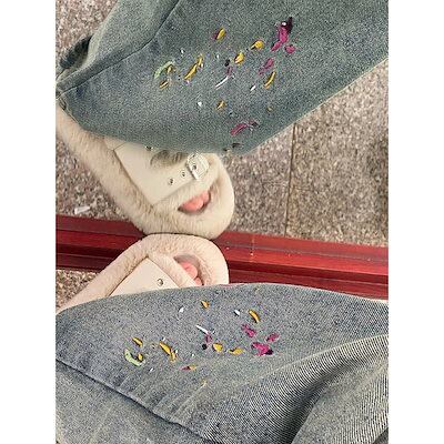 アメリカンギャルかわいいレトロ水洗ジーンズハイウエスト着痩せハイストリート刺繍ハイウエストワイドパンツ