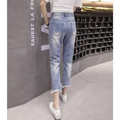 レディース 9分丈刺繍 ボトムス ジーンズ ダメージデニムパンツ ヴィンテージ クラッシュストレー 裾切りっぱなし