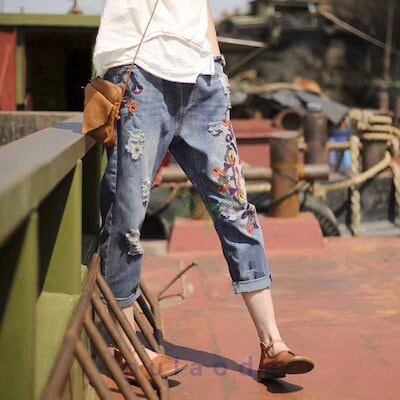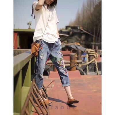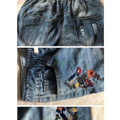 デニムパンツ レディース 七分丈 ジーパン デニムパンツ 春 8分丈ジーンズ 夏カジュアルパンツ花柄 ボ 森ガール風 ズボン ジーンズ 刺繍