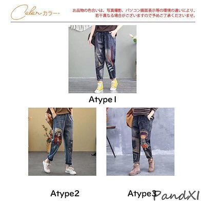 デニムパンツ レディース ワイドパンツ 森ガール風 ウエストゴム 刺繍花柄 カジュアル ストレッチ 大きいサイズ ゆったり 民族風 旅行 大人2