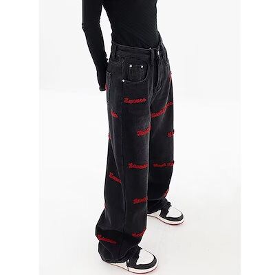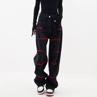 スラックスパンツ大きいサイズ刺繍ワイドパンツ復古モッピングパンツ 着痩せジーンズ