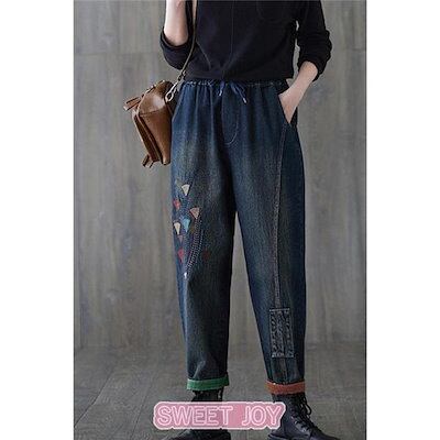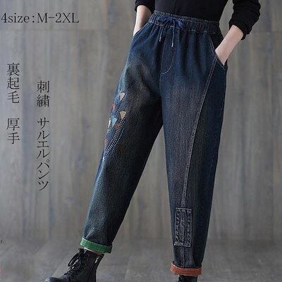 新品 大人気 サルエルパンツ デニム 刺繍 裏起毛 テーパードパンツ ボトムス ズボン レディース カジュアル ポケット付き ゆったり ウエストゴム 無地