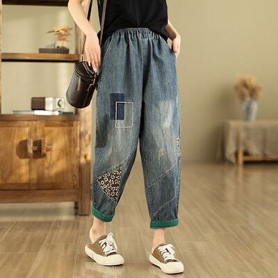 デニムパンツ レディース ジーパン サルエル ワイドパンツ サルエルパンツ ジーンズ デニム パンツ アンクル丈 カジュアル パンツ ボトムス ゆったり ウエストゴム 楽チン 刺繍 楽チン おしゃれ
