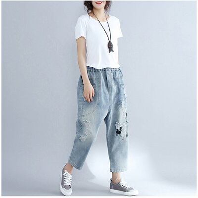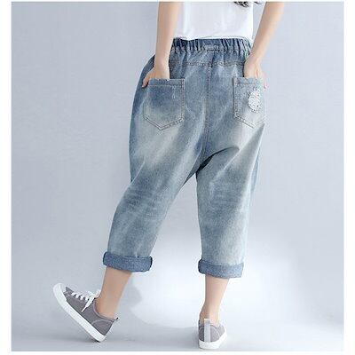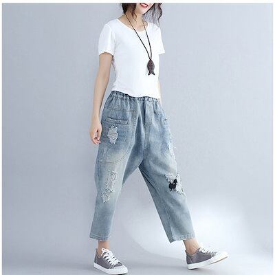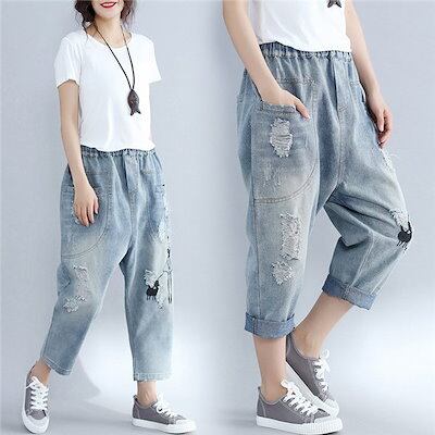 デニムパンツ レディース ボトムス ダメージ テーパード 刺繍 9分丈 サルエル ジーンズ 大きいサイズ おしゃれ 着痩せ 30代