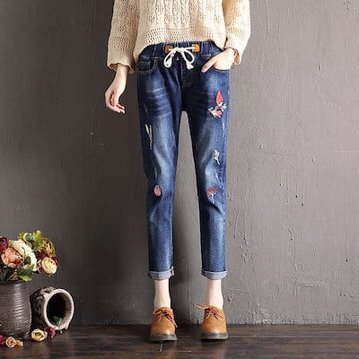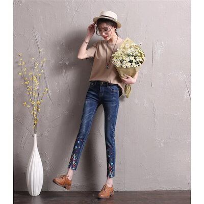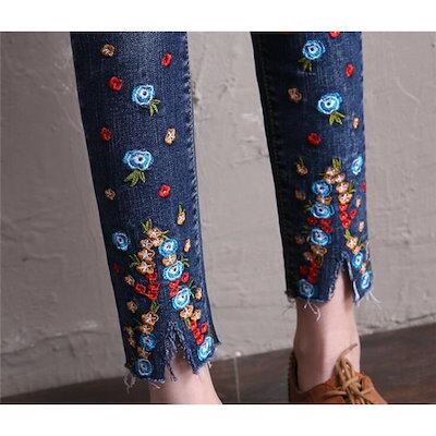 スキニー デニムパンツ レディース 刺繍 ボトムス 花柄 スリット 伸びる ジーンズ ストレッチ おしゃれ アンクル丈 カジュアル スリム 柔らかい2