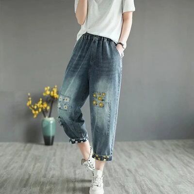 ヴィンテージフラワー刺繍アートファンハイウエストジーンズ女性の夏の新しいスリムハーレムクロップドパンツ