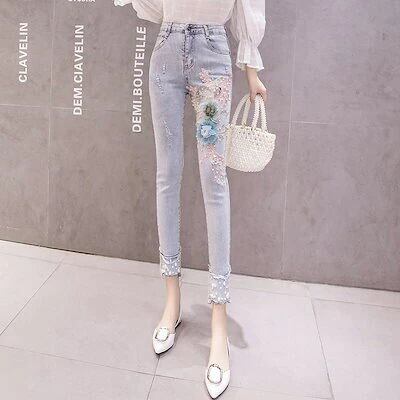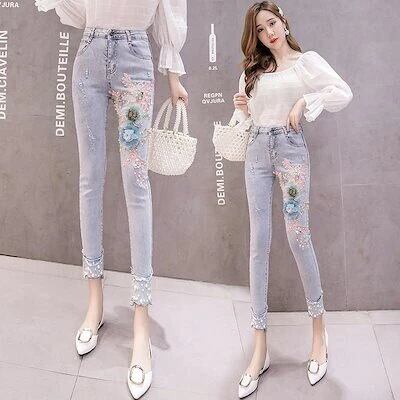 パール刺繍ジーンズ女性の春と秋の新しい女性のパンツ小さな足の薄い9ポイントのペンシルパンツ