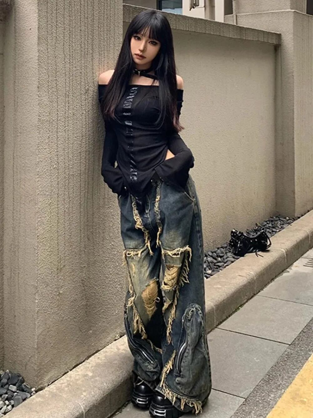 女性用のウォッシュドタッセル付きの色あせたバギージーンズ,ハイウエスト,ワイドレッグ,ルーズフィット,古いファッション,レトロなストリートヒップホップ,カジュアル,y2k ボトム ワイドレッグ バギーパンツ T240831173613_01