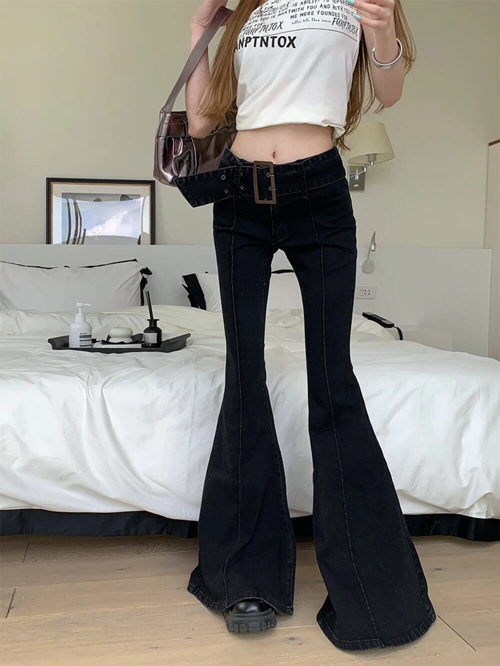 女性のためのアメリカンレトロフレアジーンズ、ローウエスト、e-girl、スリムバンデージ、ブラックコットンデニムパンツ、ハイストリートファッション、y2k ボトム ワイドレッグ バギーパンツ T240831173646_01