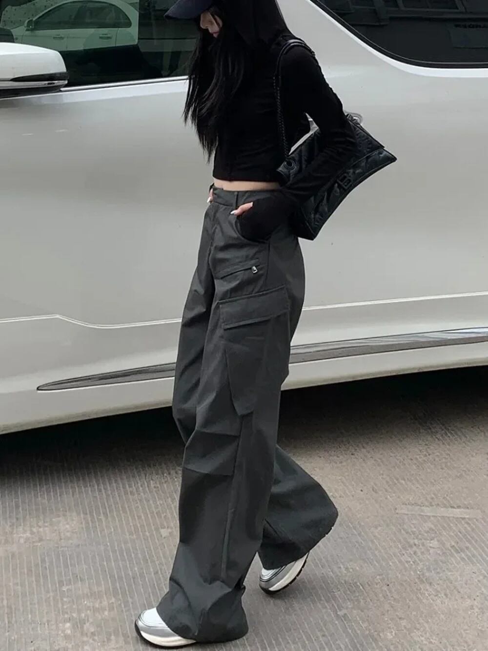 "Houzhou-女性用カーゴパンツ,グレーヴィンテージ,バギー,韓国風,ハイウエスト,ハラジュク,美的,ストリートウェア,ヒッピー,女性用 ボトム ワイドレッグ バギーパンツ T240831222638_01