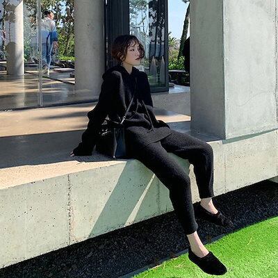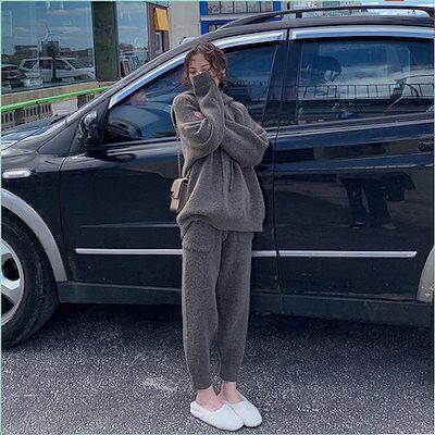 ト上下セットニットセットニット+ワイドパンツゆる体型カバークール長袖 無地 カジュアル新作 おしゃれ