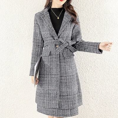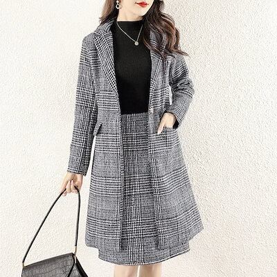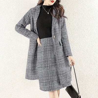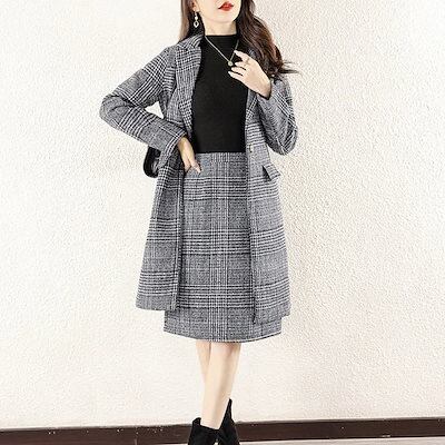スーツ襟 ラシャ セット 秋冬 新作 気質 着痩せ 千鳥格子 韓国ファッション ジャケット スカート 二点セット ウォーム コート