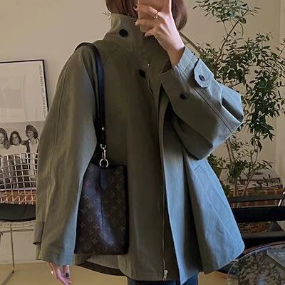 韓国ファッション レトロ 英?風 立ち襟 ファスナー ポケット デザイン ゆったり トレンチコート 秋冬 気質 ジャケット