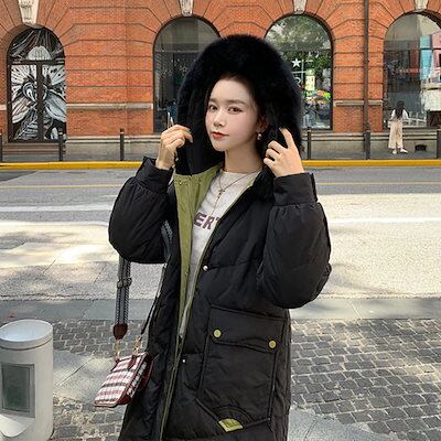 綿入れ女性用冬服2024年新型韓国版港風ミドル丈膝越し綿入れコート ファーカラー コントラストカラー コットンジャケット コート