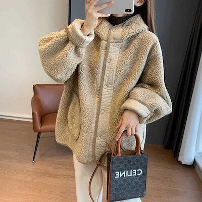 ラムウールのコート女性の秋冬の新毛むくじゃら韓国版ゆったりと厚くて痩せて見えるフード付き洋風トップスウォーム ジャケット