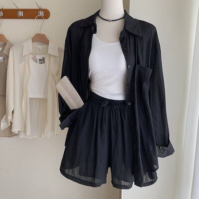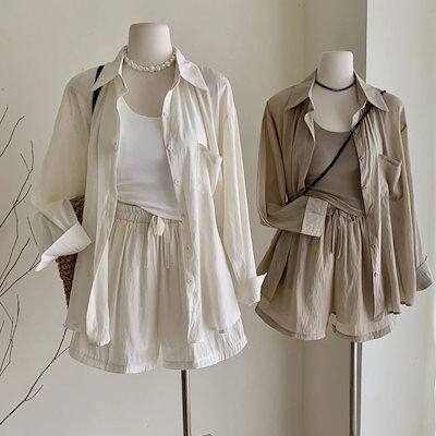 2024 夏 新作 カジュアルポロネック日焼け止めシャツ重ね着ウエストショート丈キャミソールショーツ3点セット 百掛け 韓国ファッション 涼しく楽ちんセットアップ