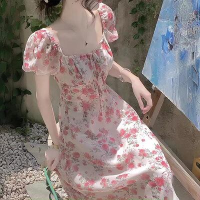 ワンピース ドレス フレンチヘボン風アート感覚ロングスカートスクエアネック 花柄 夏 レディース 韓国