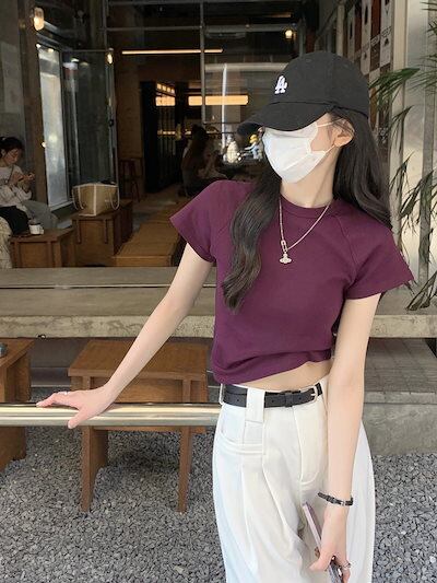 Tシャツ 綿 ハイウエストショート丈 夏 2024新型 ラウンドネックラグラン トップス 半袖 プルオーバー レディース 韓国ファッション