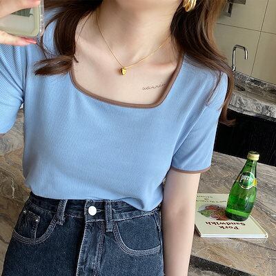 Tシャツ 高弾性 ねじ付き木綿スクエアネック 半袖 2024夏の新作 ショルダーボトムアウター トップス レディース 韓国ファッション
