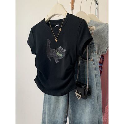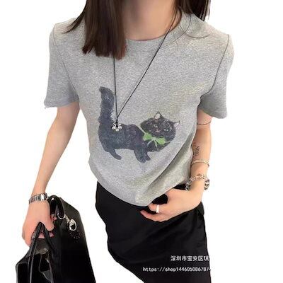 Tシャツ トップス グレー 猫ポジティブ 半袖 夏 2024新 しいスリム薄いショートセクション レディース 韓国ファッション