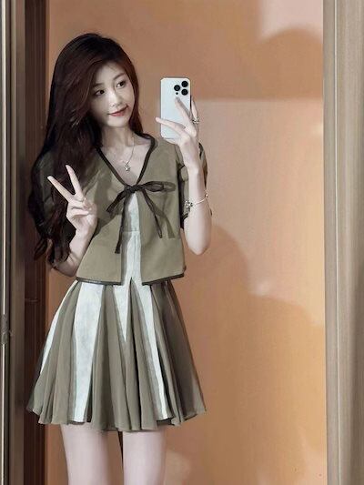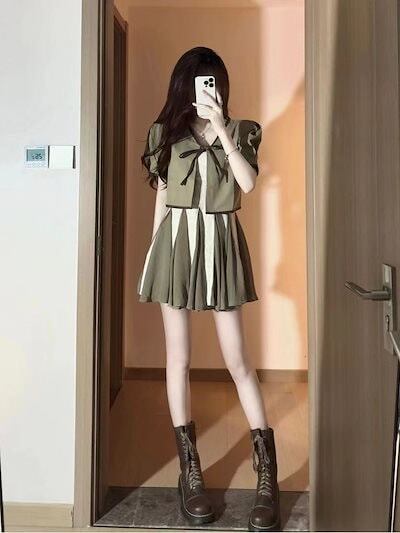 涼しく楽ちんセットアップ 大きいサイズのぽっちゃり日系学院風パッチワーク ワンピース 2点セット レディース 韓国ファッション