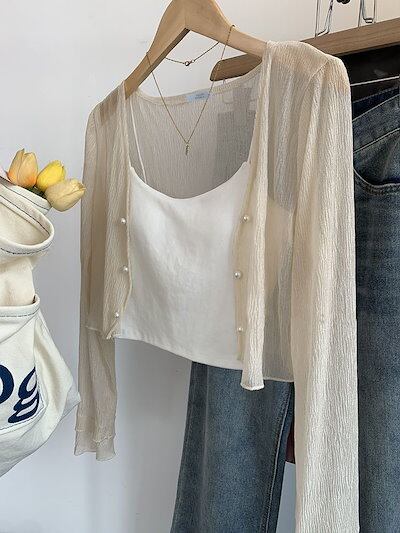【3日以内出荷】カーディガン uvカット 日焼け止め シフォンのブラウスにストールコート 薄手 パールボタン レディース 韓国ファッション