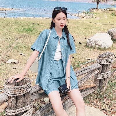 2024 夏 新作 デニムファッションスーツ半袖シャツワイドパンツ2点セット 百掛け 韓国ファッション 涼しく楽ちんセットアップ レディース