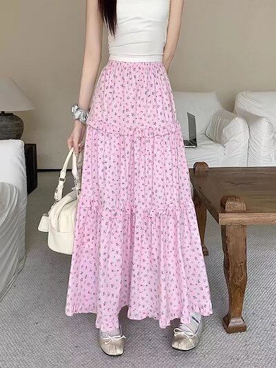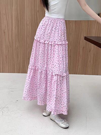 ロマンチックなフレンチ小花のパッチワークミディアムスカート2024夏の新作リゾート風階層感のあるハイウエスト半身スカート女 レディース 韓国