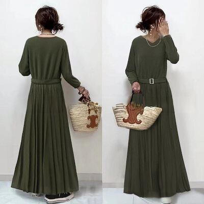 日系 気質 Vネック ワンピース シンプル ロングスカート カジュアル おしゃれ