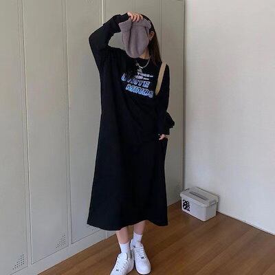 ロングタイプ スウェット ワンピース ゆったり カジュアル レディース ins 流行り