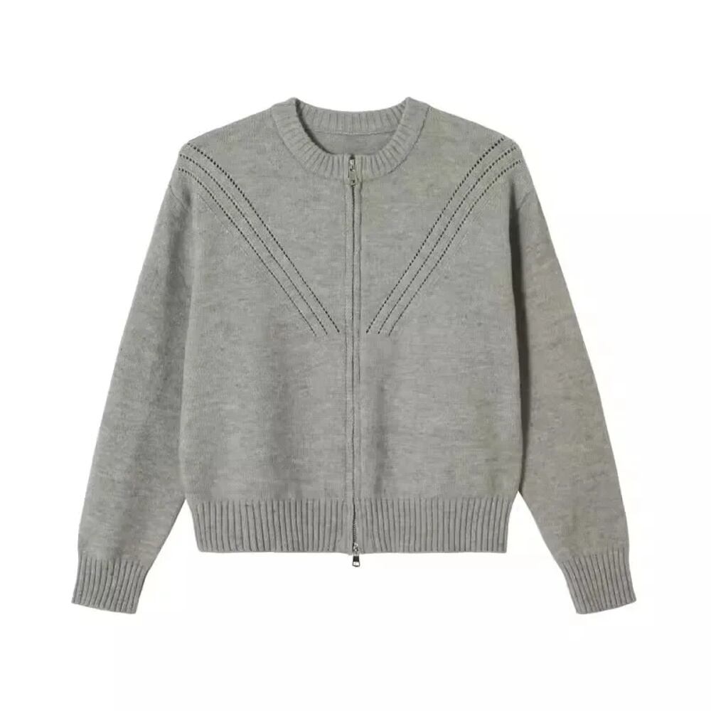 Deeptown-レディースヴィンテージジップアップカーディガン、韓国ファッション、グレーニットクロップドセーター、カジュアルトップス、無地、長袖、秋 T240926061701_01