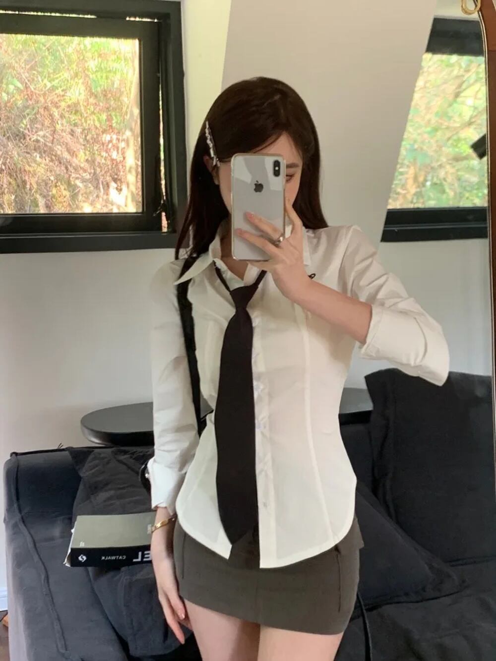 Deeptown-女性のプレッピースタイルの長袖刺shirtsシャツ、ネクタイ付き、韓国のファッション、スリムなロリータ、ハラジュクトップス、ホワイト、y2k T240926061704_01