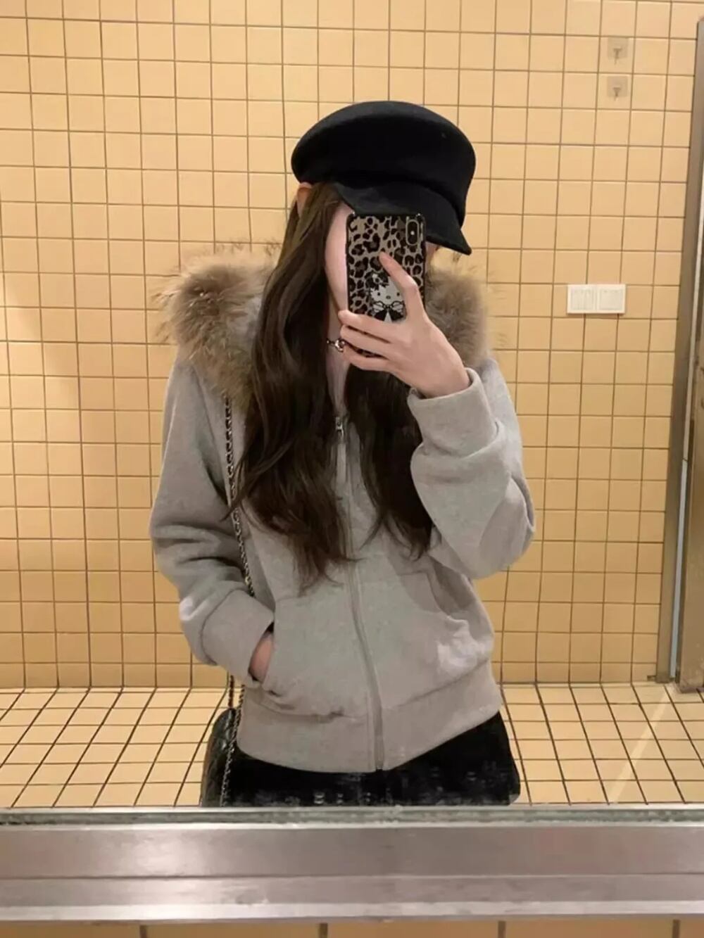 Deeptown-女性のフェイクファーの襟が付いたパーカー、ヴィンテージストリートウェア、ジップアップフード付きスウェットシャツ、グランジ原宿、長袖トップス、y2k T240926101954_01